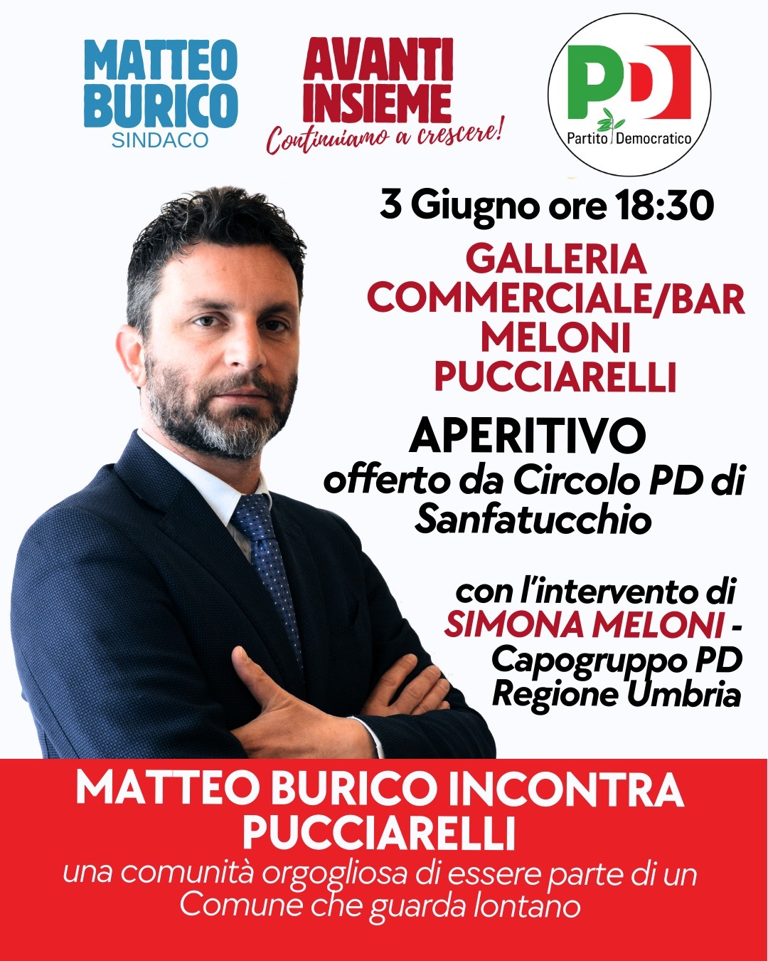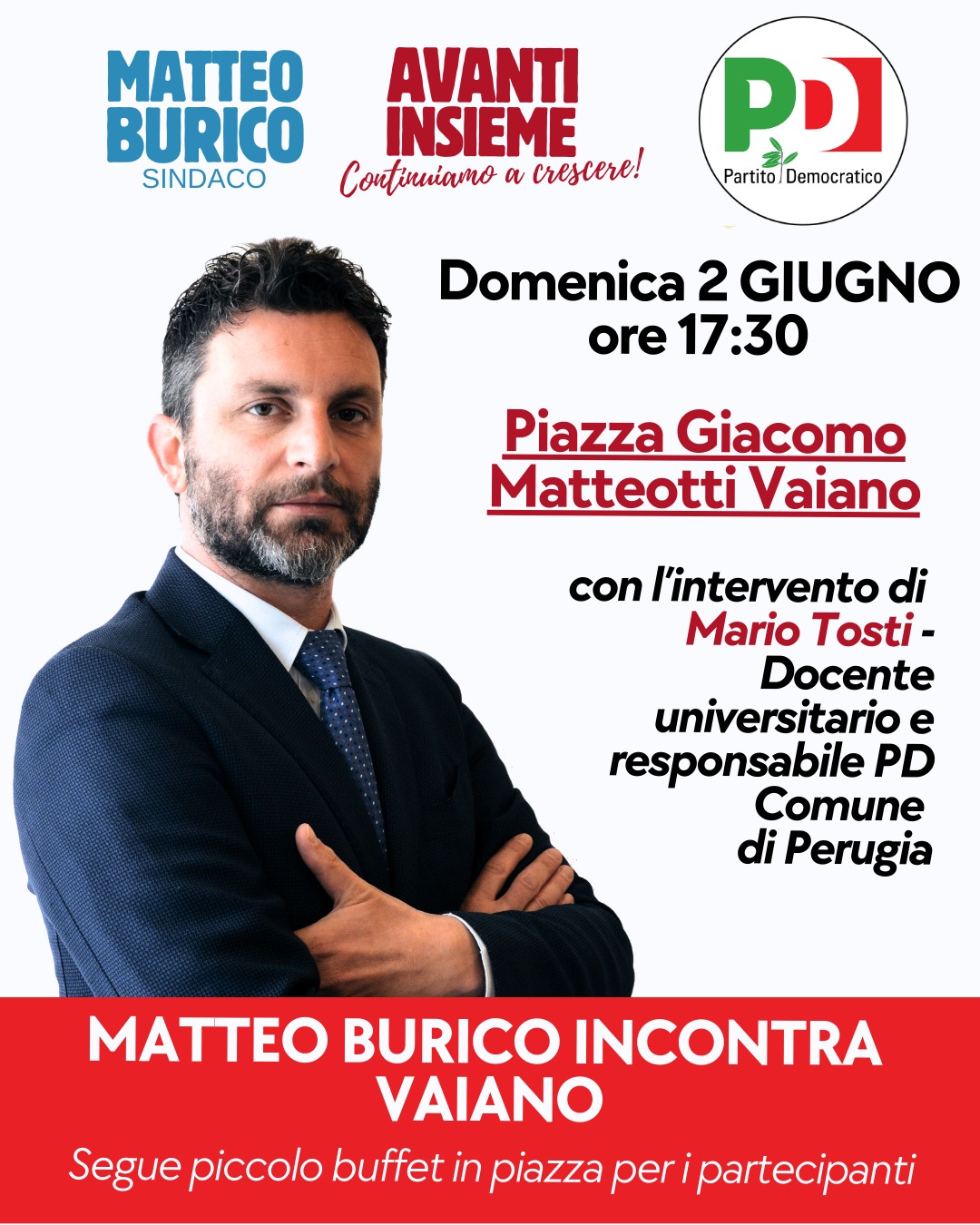 Incontro a Vaiano - Lista Partito Democratico Matteo Burico incontra la popolazione di Vaiano con l'intervento di Mario Tosti (docente universitario e responsabile PD Comune di Perugia) Domenica 2 giugno, ore 17.30 Piazza Giacomo Matteotti - Vaiano